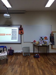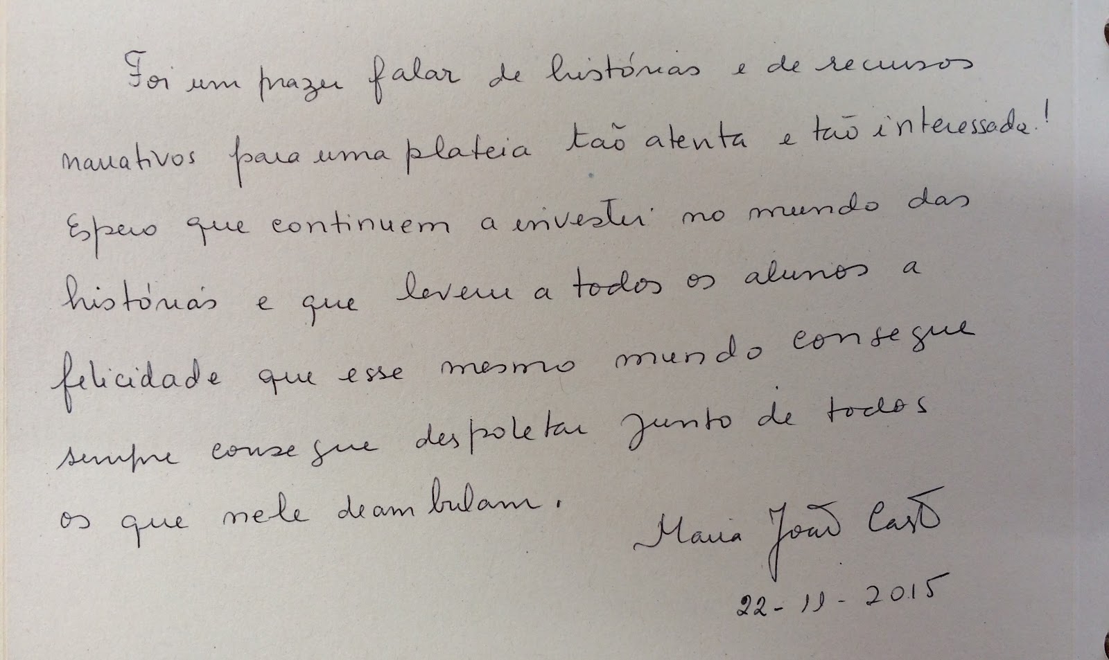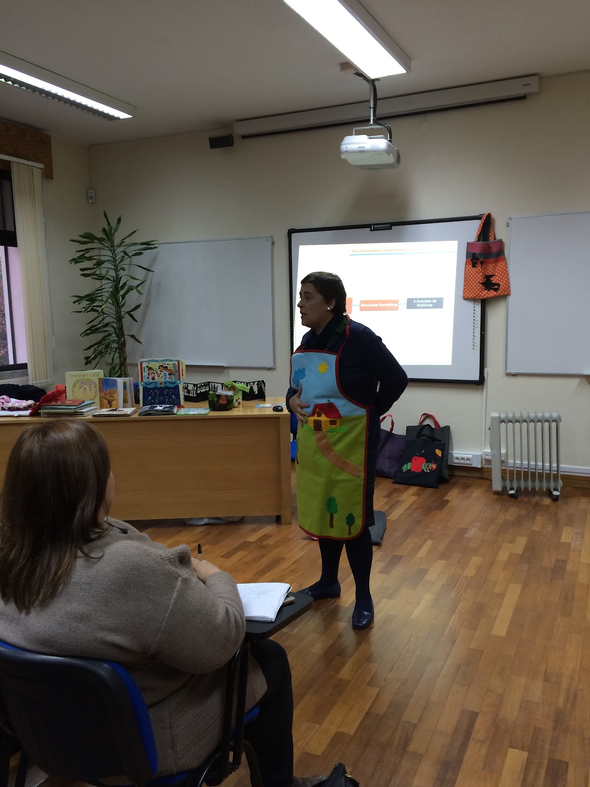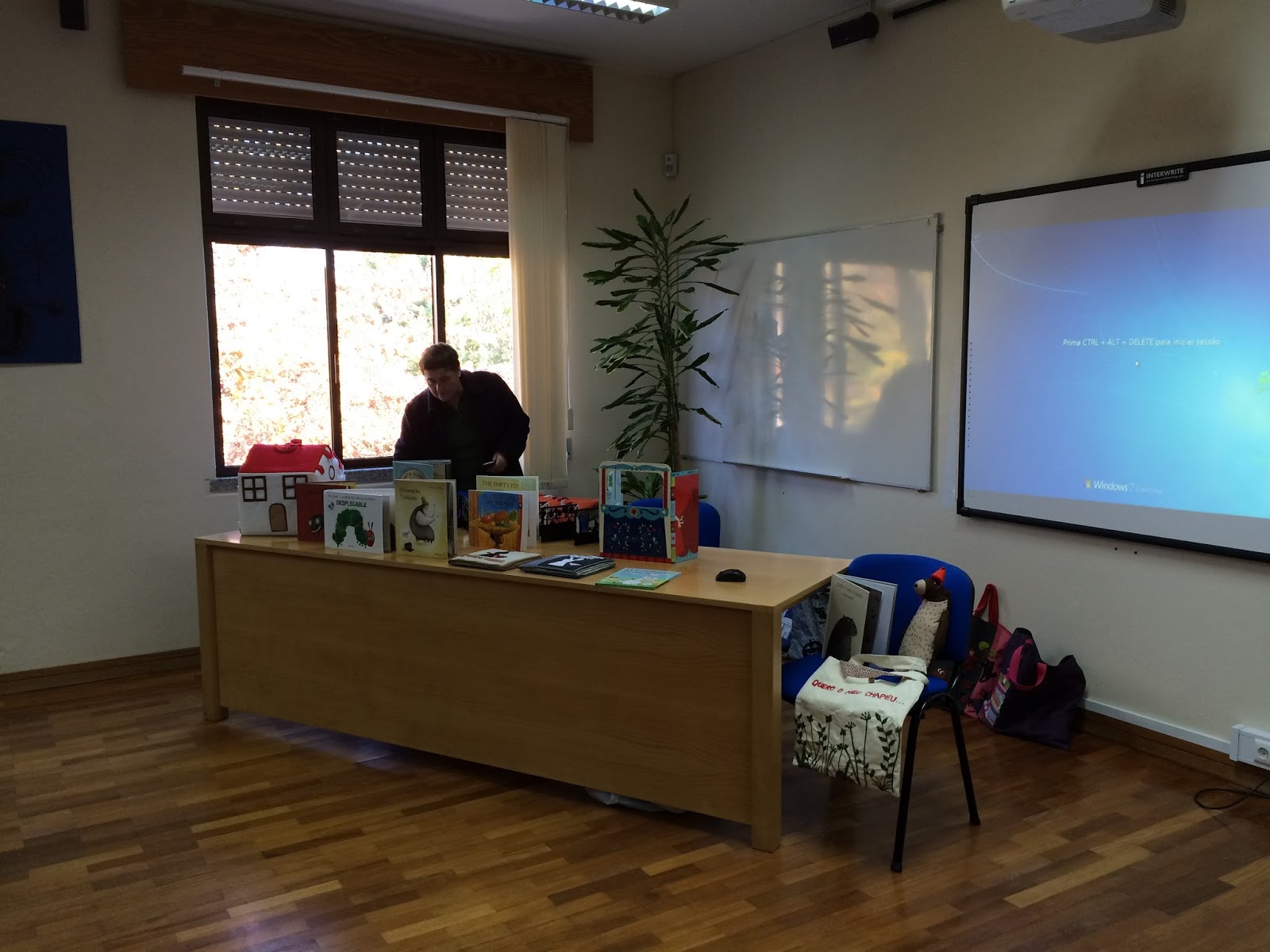No dia 23 de novembro, 2ª feira, realizou-se, na nossa escola, a sessão de formação subordinada ao tema "Recursos Narrativos ao Serviço da Leitura". Esta ação foi promovida pela Biblioteca e dinamizada pela Drª Maria João Castro, CIBE da RBE. Aqui se falou de tapetes, sacos, pedras e aventais de histórias, Kamishibais, fantoches, enfim, uma panóplia de recursos que deixaram os presentes encantados e motivados para abordar uma história, um livro, de muitas maneiras diferentes.