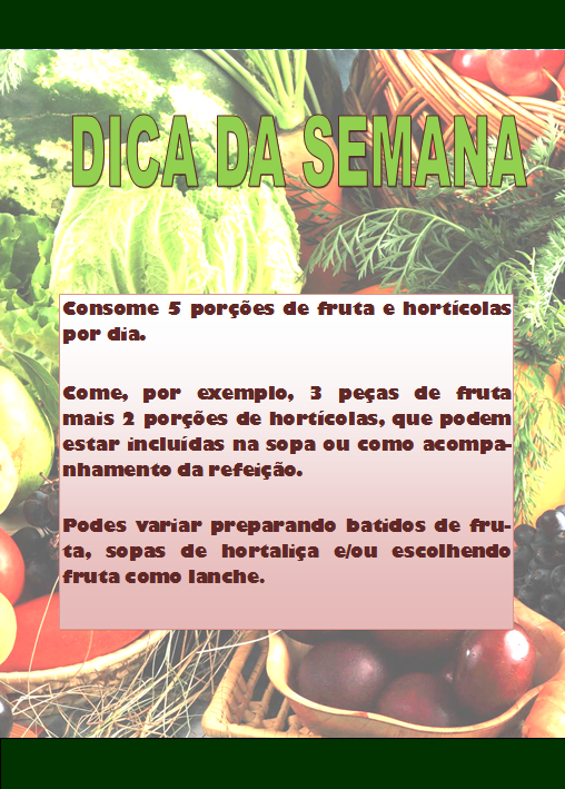 Semanalmente, é afixada a "DICA DA SEMANA". São alguns alertas, pequenos conselhos que, a serem seguidos, contribuirão, certamente, para a saúde e bem estar de cada um.