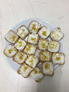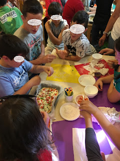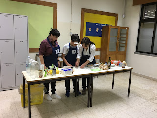 Em cada mesa, tinham diversos objetos e produtos que iriam servir, nem mais nem menos, para fazer uma ... pizza. É verdade! Em grupo, cortaram cebola, tomate, pimento, azeitonas e colocaram os ingredientes na massa que, entretanto, tinha sido distribuída, juntamente com o molho de tomate, o queijo, o azeite e os orégãos.