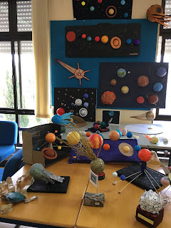 "Aprender sobre o Universo é transpor os obstáculos das distâncias astronómicas numa nave chamada “Astrofísica”. Nessa viagem imaginária os alunos do 7º ano, descobriram as estrelas, os planetas, os cometas e perceberam a beleza de um Universo por descobrir. Estão em exposição na nossa BE todos os trabalhos realizados pelos alunos de 7.º ano inspirados na Unidade I - Espaço. Esta atividade teve como objetivo o aprofundamento de conteúdos através da pesquisa digital e bibliográfica e da performance de escrita e criatividade artística. Estão todos de parabéns!"